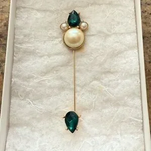 This elegant Richelieu brooch pin features a stunning green gemstone, simulated pearls & rhinestones set in a gold finish, perfect for adding a touch of sophistication to any outfit.