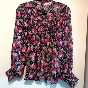 Chic and beautiful floral blouse with vibrant pink and black design. Long ballon style sleeves and elegant style. Sheer fabric.