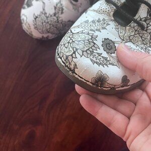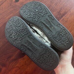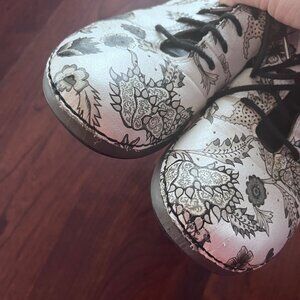 Alegria Essence Winter White Size 39 (US 9). White leather shoes with black print. In overall good pre-owned condition. Some scratching on the toe of one shoe, pics included to show detail. Not overly noticeable with the print.