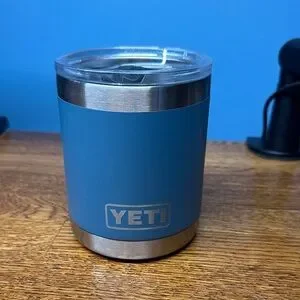YETI tumbler in blue with stainless steel accents. Perfect for keeping drinks hot or cold.