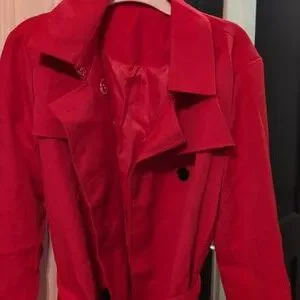 Bold red trench coat with classic design. Features a belted waist and button closure.