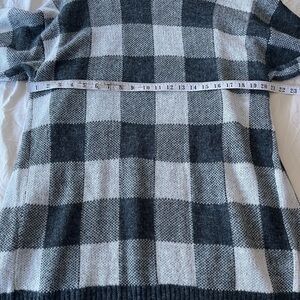 Cozy and classic, this American Eagle buffalo plaid open-front cardigan is the perfect layering piece for chilly days. Features a black and white checkered knit with two front pockets, ribbed trim, and a slouchy relaxed fit. Mid-thigh length for great coverage.