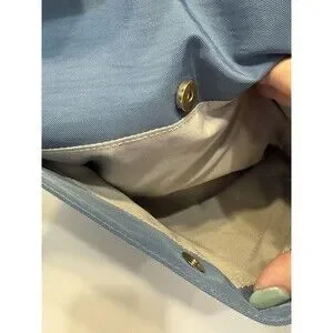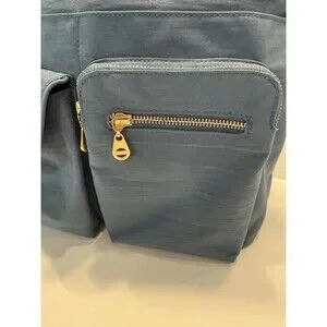 Stylish blue shoulder bag. Features multiple pockets. Gold-tone zippers and accents.