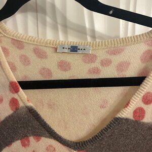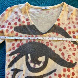 Turn heads in this ultra-rare and collectible Blue Area designer sweater, featuring a bold, pop-art graphic eye motif on a creamy backdrop splashed with painterly red polka dots. A clear nod to Roy Lichtenstein’s iconic comic book style, this sweater is wearable art — soft, edgy, and incredibly unique.