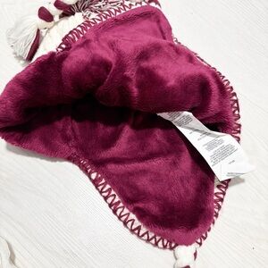 Warm knit hat with ear flaps. Cream with burgundy accents. Perfect for cold weather.