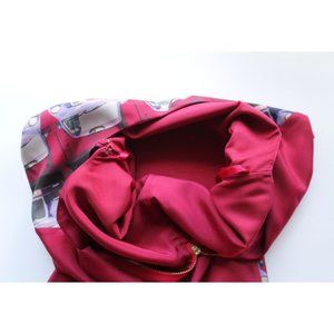 Exposed back zip closure. Pleated back bottom hem.