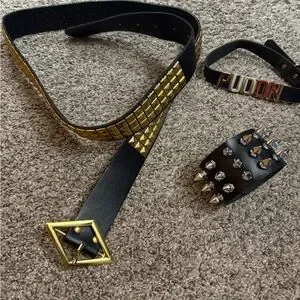 Worn once. Harley Quinn studded belt (medium) and bracket. Choker with Puddin in gold. Harley’s bat.