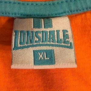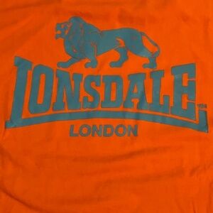 Lonsdale of London t-shirt in XL. Neon orange with blue writing. Measures across flat pit to pit 23". And in back from below collar seam to end of t-shirt it is 27". Great condition.