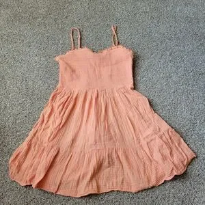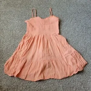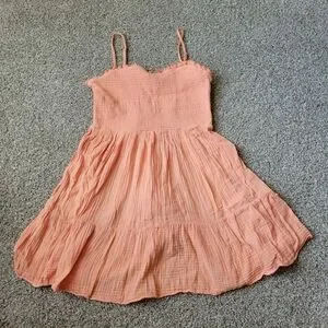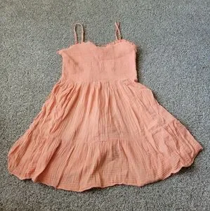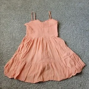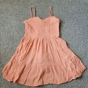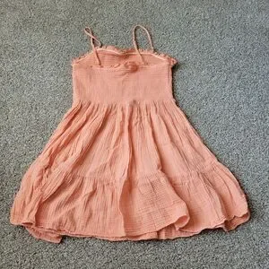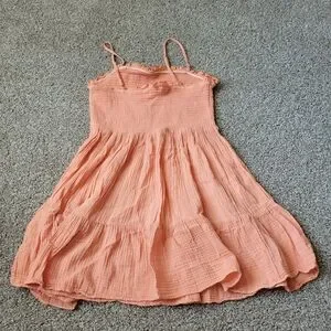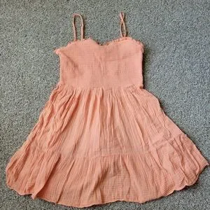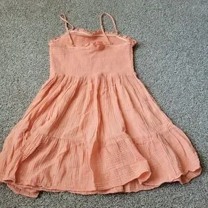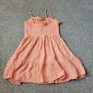 Adorable coral dress with spaghetti straps. Lightweight and breezy for casual outings.