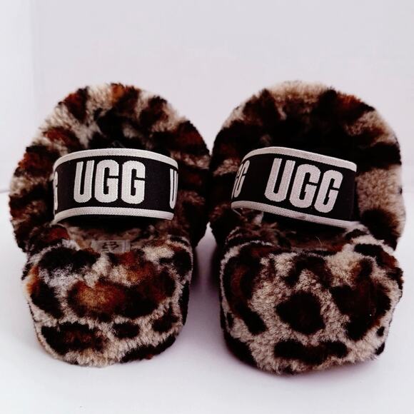 UGG fluff yeah Leopard slippers animal print fluffy sling back open toe, women’s size 8 in good condition, minimal wear.