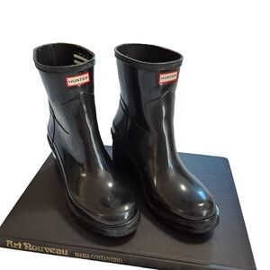 Stylish black rain boots by Hunter. Perfect for wet weather. Size 7. Excellent pre-loved condition.