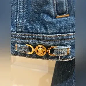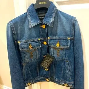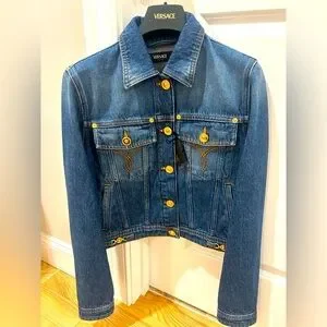 Stylish Versace denim jacket. Features gold button accents. Perfect for casual wear.
