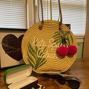 Chic straw shoulder bag. Features green leaf accents. Pink pom-pom cherries add charm. Perfect for casual outings.including a HUGE Kate spade dust bag. Also Kate spade sunglasses with case and dust cloth.