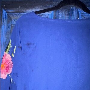 Elegant blue dress with vibrant floral embroidery. Perfect for any occasion. Several stains, gently used 😊