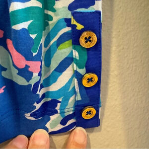Lilly Pulitzer pima cotton t-shirt dress in blue coral Wade and Sea pattern. The 3/4 sleeve Riva Dress has a notched neckline, side slits, gold buttons on the sleeve, and is a comfortably chic way to incorporate print into your day. Put on this cotton dress and walk over to your favorite breakfast spot, then head over to the cabana and hop in the hammock for a little nap.