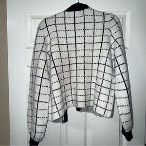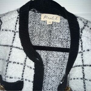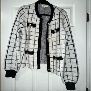Chic grid pattern blazer with gold buttons. Features black trim and pocket accents. Perfect for a sophisticated look.
