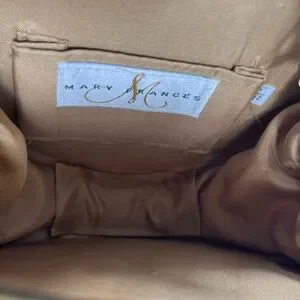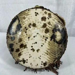 Rare Mary Frances lion face beaded handbag with intricate hand-sewn beadwork, sequins, and 3D floral accents. Features fringe bead mane, faux snakeskin back, and long chain strap with beaded details. Satin interior with Mary Frances label and slip pocket. Measures approx. 6.5” diameter x 2.5” deep. Excellent collectible statement piece!