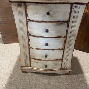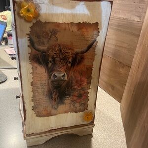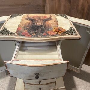 Add a touch of rustic charm to your home with this decorative jewelry box featuring a Highland cow design. The cream and brown tones complement any decor. Perfect for storing small items or as a unique accent piece. 12 7/8 T x 9.5 W X 6 3/4 D.