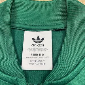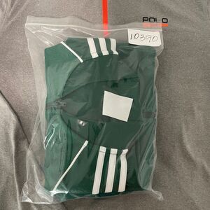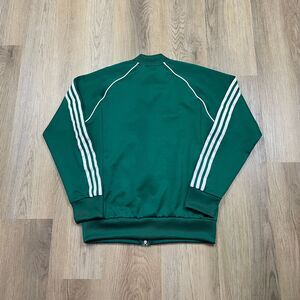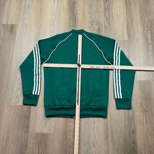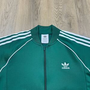 Stylish adidas bomber jacket. Rich green color with white stripe accents. Iconic logo on chest. Comfortable and trendy.