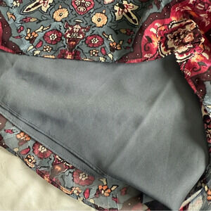 Color: Slate blue base with burgundy, blush, and cream floral medallion print