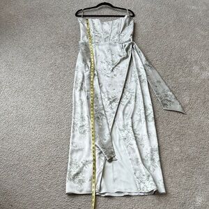 This elegant strapless dress features a beautiful floral pattern, perfect for any special occasion. The soft cream color adds a touch of sophistication.