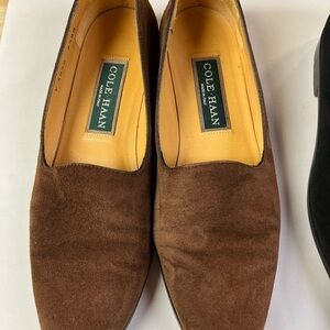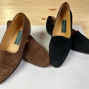 Two pairs of stylish women’s Cole Haan flats. One pair is brown and the other pair is black. Size for both is 6.5AA. They are a narrow size.