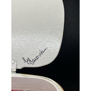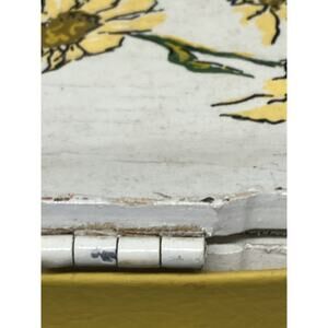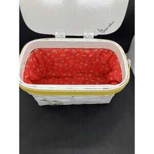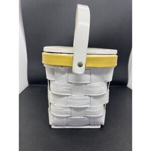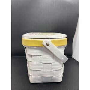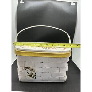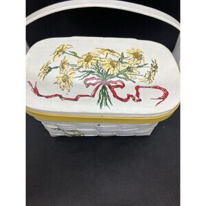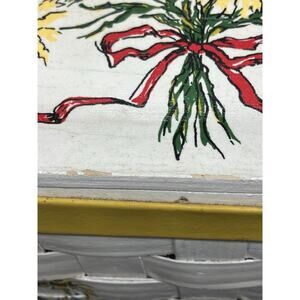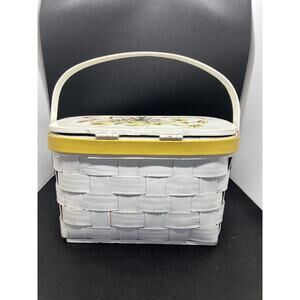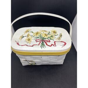 This vintage painted purse picnic basket by Caro Nan features a unique floral daisy design, perfect for a picnic occasion. The wicker material with a white painted finish adds a touch of charm and character to the piece. Signed by the artist, this item combines functionality and artistry, making it a collectible decorative item for any vintage enthusiast. There are a few imperfections seen in the photos but that does not take away from its charm.