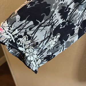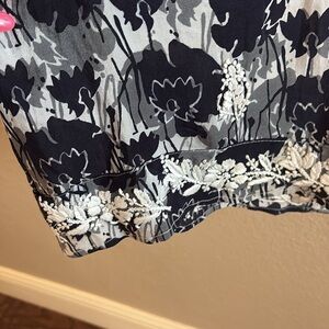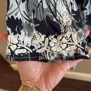 This draped silk dress has a classic color combination and a unique floral print. The simple shape is flattering and comfortable. A stunning dress/tunic featuring delicate hand embroidery on the neckline and the hem. It’s a classic for all times.