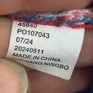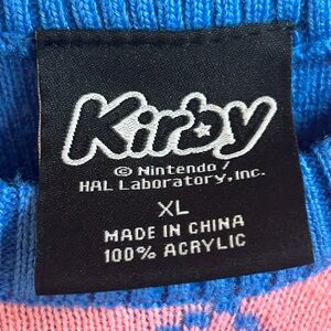Nintendo Kirby Adult Graphic Knit Christmas Sweater Pink-Blue. Tag reads Kirby, Nintendo / Hal Laboratory Inc., Acrylic, XL.