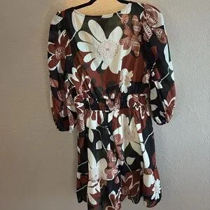 Stylish floral print dress with 3/4 sleeves. Features a mix of black, brown, and cream colors. Elastic waist, with full sleeves.