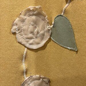 Kunky's creates original, custom-made clothing. This hoodie features rose appliqué on the front and back, a loose A-line shape, and a lettuce edge on the hem and cuffs. New with tag, excellent condition, soft, warm yellow, tan floral with green leaves, size large