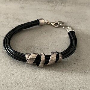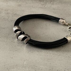 Vintage Silpada City Slicker Sterling Silver Twist Black Leather 7.5-8" Bangle Bracelet