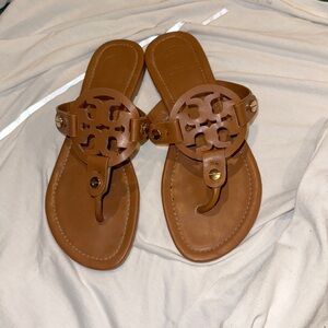 Stylish Tory Burch sandals. Features iconic logo design. Comfortable and chic.