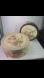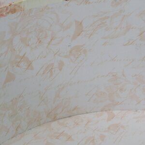 Large Box: Features a lovely pink and cream floral rose pattern with script writing. The lid has a matching rose bouquet design. It has a pink braided rope handle.