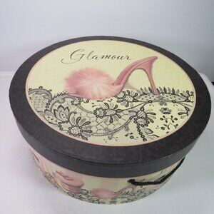 Smaller Box: Features a glamorous, vintage fashion-themed design with illustrations of perfume bottles, a high-heeled shoe with a fuzzy pom-pom, and cosmetics. The lid is also decorated with the high heel and the word "Glamour" in a beautiful script. It has a black braided rope handle.