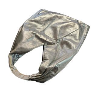 Details: Sleek metallic faux leather exterior with a reinforced single top handle for durability. Designed with an internal snap closure and black jacquard lining. Shows primary rubbing at the handle and isolated minor scratches and scuffs, but no holes, tears, stains, stickiness, or smells. Inside is clean and well-maintained.