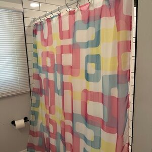 Brighten up your bathroom with this colorful geometric shower curtain. Featuring a vibrant mix of pink, blue, and yellow, it adds a playful touch to any space.