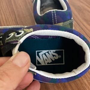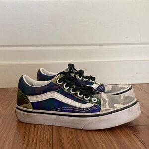 Vans sneakers with a unique camo and multicolor design. Durable and stylish for active kids.