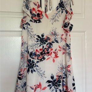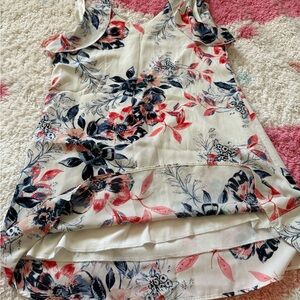 Elegant sleeveless dress featuring a vibrant floral pattern. Ruffle details add a touch of charm. Perfect for any occasion.