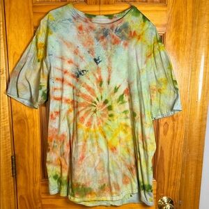 Vibrant tie-dye t-shirt with a spiral pattern. Features a mix of colors for a bold look. Upcycled CSG t-shirt size XL dyed with green, orange, yellow and a splash of blue dye. Handmade by jrsdesignsltd in Maine with ❤️