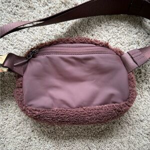 Stylish brown sherpa belt bag. Features adjustable strap and zip closure. Ideal for on-the-go use.