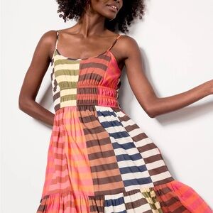 Turn heads in the Silvana Maxi Dress by Hutch, featuring a gorgeous multi-color, two-tone stripes, elastic waistband, adjustable straps, and a tiered maxi skirt.