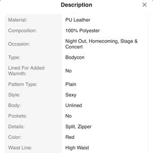 Sleek red faux leather skirt. Features a stylish front slit. Perfect for any occasion.