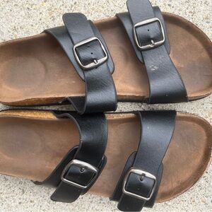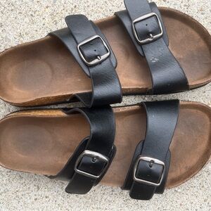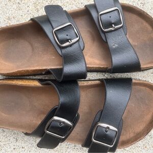 Stylish black leather straps. Secure buckle design. Comfortable brown footbed.