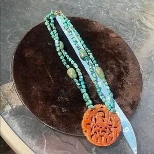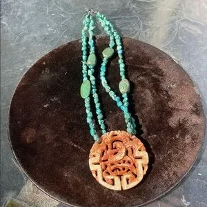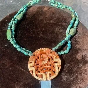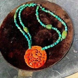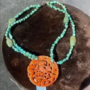 This stunning handcrafted necklace features double stranded real vibrant turquoise beads paired with a striking orange pendant. Perfect for adding a pop of color to any outfit.stone unknown it’s not jade due to acetone jade test one side of carved stone is orange brown other side is more faded but stone design on fading quite cool, the turquoise beads are beautiful