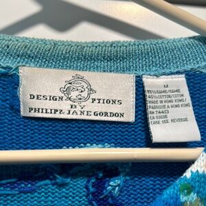 This cardigan features a dynamic wave-inspired pattern in shades of blue and white, creating a playful and artistic look. The medium to heavy knit ensures warmth and comfort, making it ideal for cooler weather. Its unique design adds a touch of nautical/beach charm to any outfit. Please note: some of the sequins have come off on the bottom edges and a few throughout the body of the sweater. This does have small shoulder pads which could be easily removed if not wanted. Clear buttons on front.