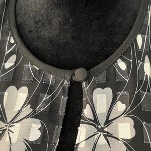 This previously owned elegant duster is in excellent condition. It features a black and white floral print on a sheer fabric. The style is straight long line open front with a one button closure and shoulder pads . Collarless and long sleeved, it will pair well with a little black dress for a party or evening out. For a casual fun look , try it with flowy pants and a tank top.