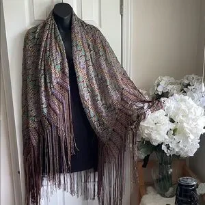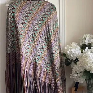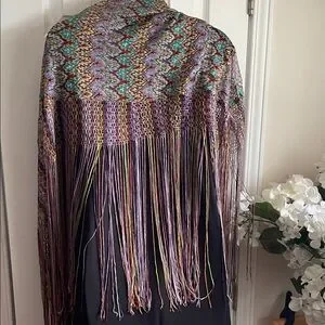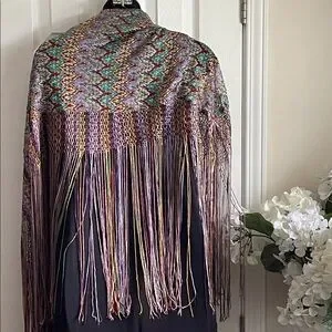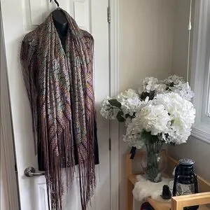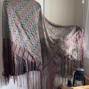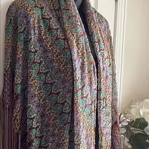 A piano shawl, characterized by its intricate patterned design and long, multi-colored fringe. This type of shawl is often made of luxurious fabric and features elaborate embroidery or patterns, adding a touch of elegance, and historically used as a decorative cover for a Piano, Table or worn as a Fashion accessory. πππ