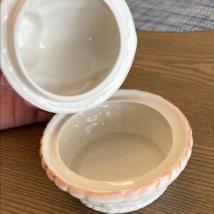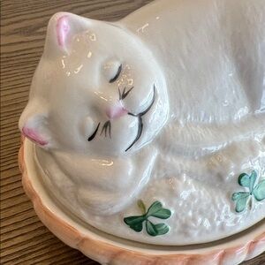 Belleek Cat in a Basket Trinket Box | 11th Mark Green | Ireland. Charming trinket box with a sleeping cat design. Features white ceramic with green shamrock accents. Perfect for small keepsakes.