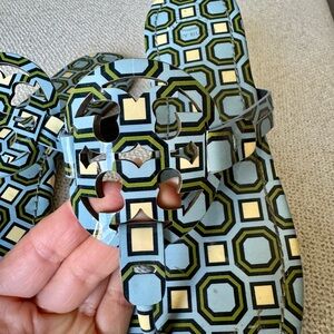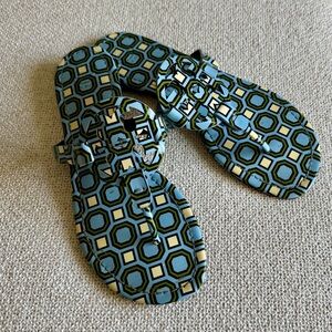 Stylish Tory Burch sandals with a geometric pattern. LIKE NEW! Barely worn. Features blue and cream colors. Perfect for casual wear. Smoke free home.